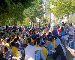 Okulun önündeki parkta düzenlenen etkinlikte öğrenciler, veliler, öğretmenler, okul çalışanları ve servis şoförleri bir araya gelerek aynı anda kitap okudular.